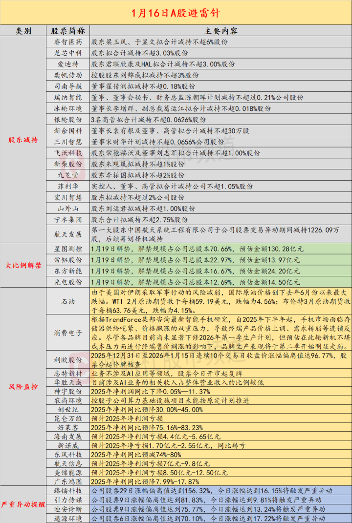 导读:财联社1月16日投资避雷针,近日,A股及海外市场潜在风险事件如下。国内经济信息方面包括:1)新机调价影响销售需求,2026年第二季度起智能手机生产承压明显;2)BBA在华销量跌回七八年前;公司方面重点关注包括:1)利欧股份2025年12月31日至2026年1月15日连续10个交易日收盘价涨幅偏离值达96.77%,股票今起停牌核查;2)20CM六连板志特新材表示业务不涉及AI应用等领域,股票今日开市起复牌;海外市场重点关注包括:1)国际油价15日显著下跌;2)LME金属期货跌多涨少,LME期锡收跌1431美元。
