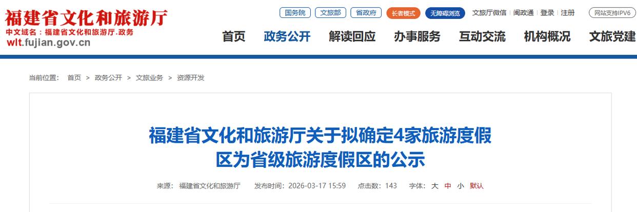 福建省文化和旅游厅最新公示拟确定漳州市龙江岁月旅游度假区漳州市华安土楼文化旅游度假区宁德市周宁仙风山旅游度假区宁德市嵛山岛旅游度假区为省级旅游度假区公示时间为2026年3月17日—2026年3月23日原文如下↓