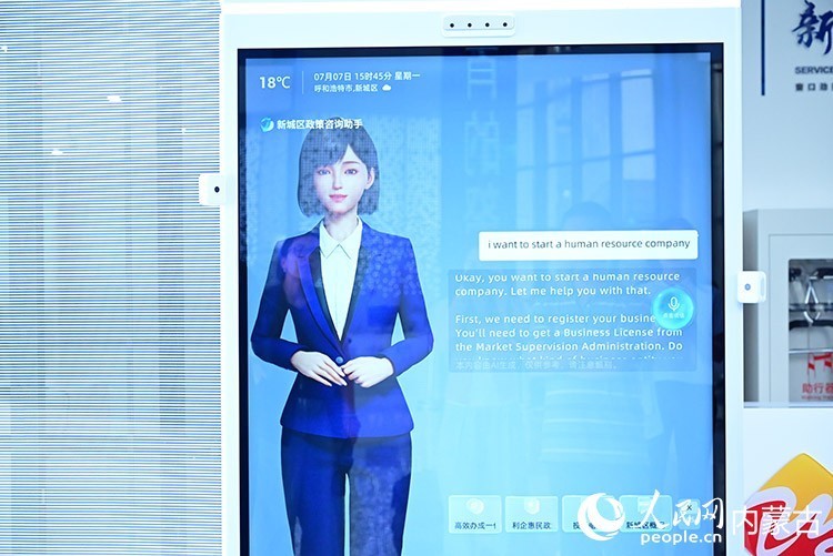 就在不久前的5月份,呼和浩特市新城区政务服务中心引入DinTal政务数智员工“新小政”。行政审批政务服务与数据管理局综合审批股股长尹斯聪向人民网记者介绍,“新小政”每天可以分担将近150人次的常规回答,能给窗口减轻80%以上的负担。现在可以解答的问题大约1400多个政府事项,包括中央、省、盟市和区一级的所有利民惠企的政策,全部可以覆盖到。
